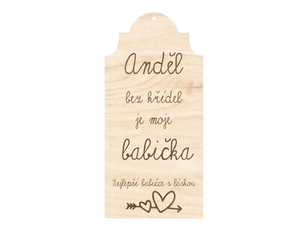 Krásná jednovrstvá dřevěná cedulka s něžným věnováním pro tu nejúžasnější babičku. Text „Anděl bez křídel je moje babička. Nejlepší babičce s láskou.“ je gravírovaný přímo do překližky.