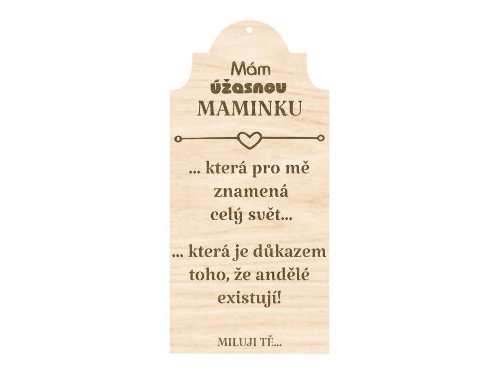 Krásná jednovrstvá dřevěná cedulka s věnováním všem maminkám, které pro nás znamenají celý svět. Text „Mám úžasnou maminku… která pro mě znamená celý svět… která je důkazem toho, že andělé existují! Miluji tě…“ je vygravírovaný přímo do překližky.