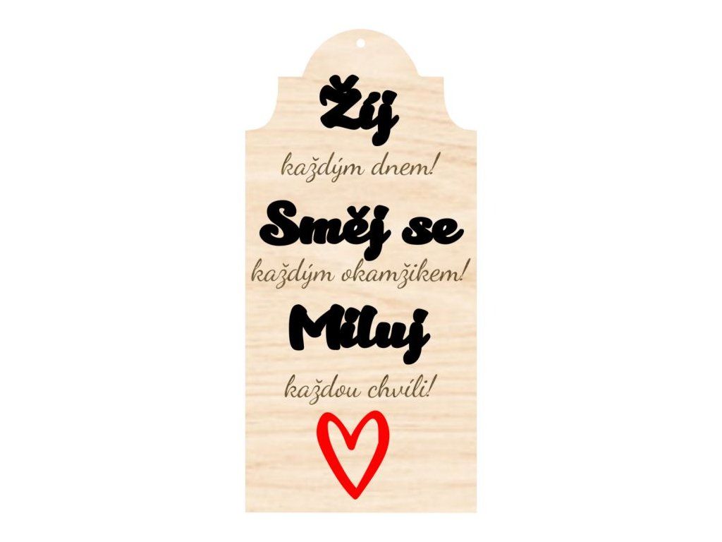 Cedulka je vícevrstvá – horní vrstva obsahuje slova „Žij, směj se, miluj“ a srdíčko ve spodní části. Srdíčko je nabarvené červenou barvou, ostatní části jsou černé, což vytváří krásný 3D efekt a dodává dekoraci na výraznosti. Skvělý dárek pro blízké i stylový doplněk do vlastního prostoru. ❤️🖤