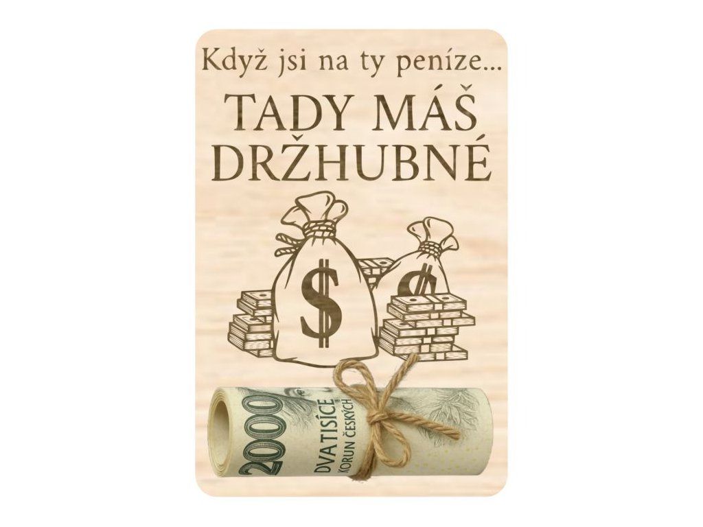Tato originální dřevěná destička na peníze je vtipným způsobem, jak darovat "držhubné" nebo nějaké malé kapesné. Na destičce je text "Když jsi na ty peníze... tady máš držhubné" a skvěle se hodí jako vtipný dárek pro přátele nebo rodinu. Destička je navíc opatřena dvěma vyřezanými dírkami pro provlečení provázkem nebo mašlí, takže je ideální pro uchycení bankovky.
