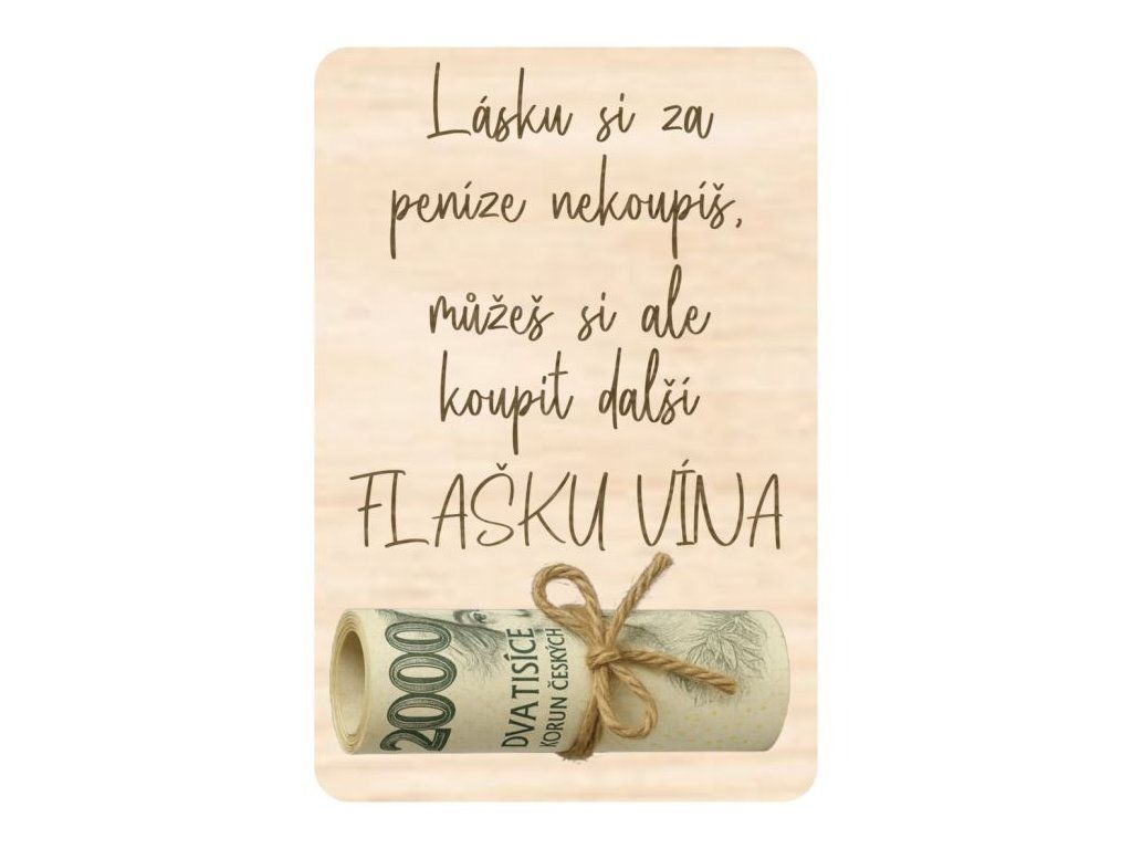 Tato dřevěná destička na peníze s vtipným textem "Lásku si za peníze nekoupíš, můžeš si ale koupit další flašku vína!" je skvělým dárkem pro milovníky vína a humoru. Na destičce jsou vyřezány 2 dírky pro provlečení provázkem nebo mašlí k uchycení bankovky.