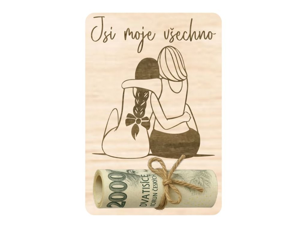 Tato krásná dřevěná destička na peníze s nápisem "Jsi moje všechno" je dokonalým dárkem pro vaši milovanou osobu. Na destičce jsou vyřezány 2 dírky pro provlečení provázkem nebo mašlí, což umožňuje snadné uchycení bankovky.