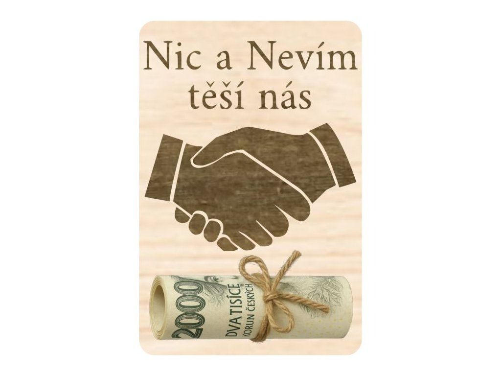 Tato originální dřevěná destička na peníze je skvělým dárkem pro ty, kteří nikdy neví, co si přát. Na destičce je vtipný text "Nic a Nevím těší nás", což odkazuje na častou odpověď na otázku "Co chceš k narozeninám?" Navíc je doplněna o obrázek dvou rukou, které se drží navzájem. Destička je vyřezána se dvěma dírkami pro provlečení provázkem nebo mašlí k uchycení bankovky.
