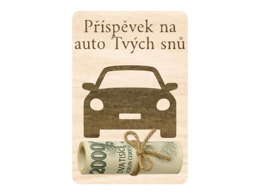 Tato dřevěná destička na peníze s nápisem "Nové auto" je originální způsob, jak podpořit někoho v získání nového vozu. Na destičce jsou vyřezány 2 dírky pro provlečení provázkem nebo mašlí, což umožňuje snadné uchycení bankovky.
