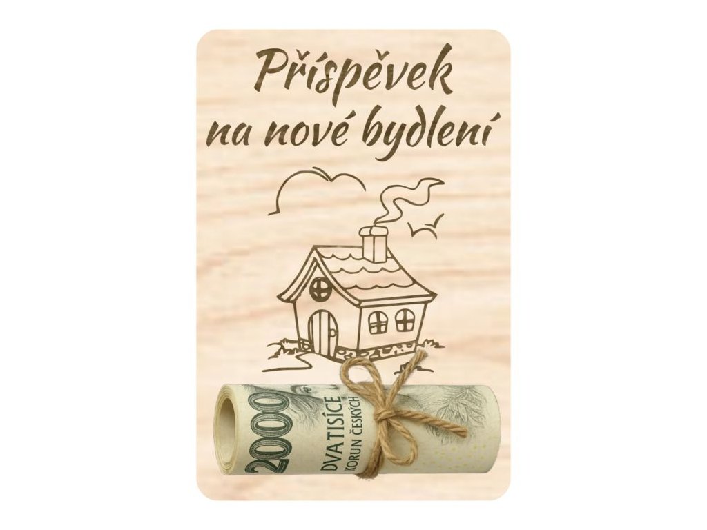 Originální dřevěná destička na peníze s motivem „Nové bydlení“ je ideální dárek k nastěhování nebo kolaudaci. V destičce jsou vyřezány 2 dírky pro provlečení například provázkem nebo mašlí k uchycení bankovky.