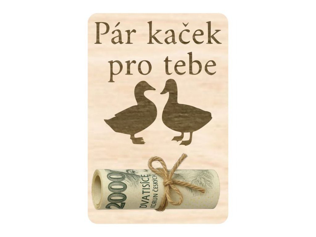 Tato vtipná a originální dřevěná destička na peníze je ideálním dárkem pro každou příležitost. Na destičce je text "Pár kaček pro tebe" a dvě kačenky, které tvoří dokonalý "pár" a zároveň odkazují na oblíbený český výraz "pár kaček" jakožto pár peněz. Destička je vyřezána s dvěma dírkami pro provlečení provázkem nebo mašlí k uchycení bankovky.