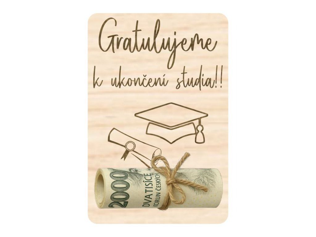 Dřevěná destička na peníze s motivem „Ukončení studia“ je perfektní dárek pro čerstvého absolventa. V destičce jsou vyřezány 2 dírky pro provlečení provázkem nebo mašlí k uchycení bankovky.