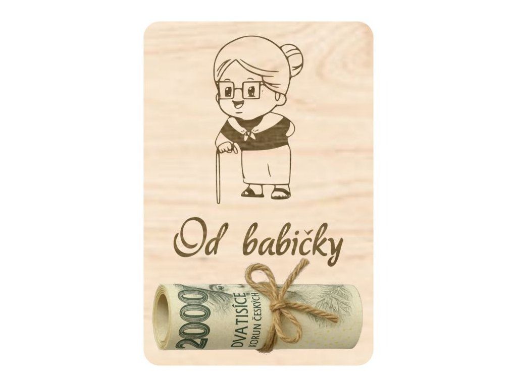 Tato dřevěná destička s textem „Od babičky“ je krásným a osobním dárkem, který jistě potěší každého, kdo obdrží peníze od své babičky. Na destičce jsou vyřezány 2 dírky pro provlečení například provázkem nebo mašlí k uchycení bankovky. Skvělý způsob, jak přidat daru osobní a kreativní nádech! 👵💰