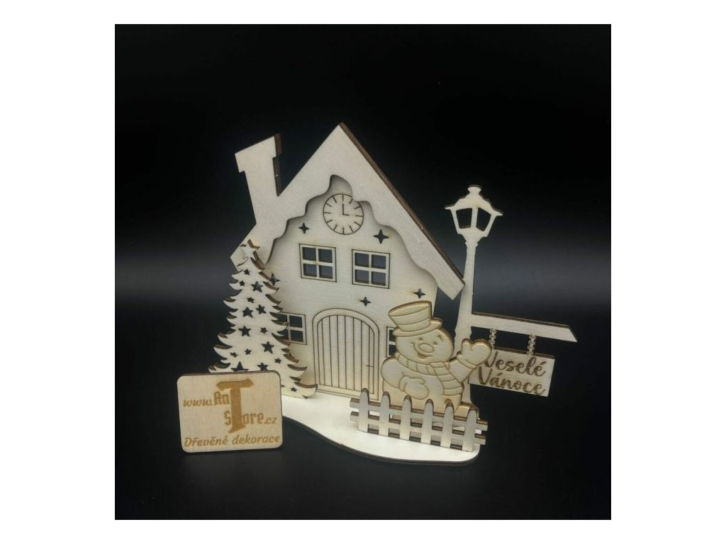 Vytvořte kouzelnou vánoční atmosféru s dřevěným domečkem na podestě, zdobeným nápisem "Veselé Vánoce." Tento detailně propracovaný kousek zahrnuje vánoční stromeček, plot a sněhuláka mávajícího zpoza plotu. Perfektní jako součást vánoční dekorace pro váš domov či zimní výzdobu.