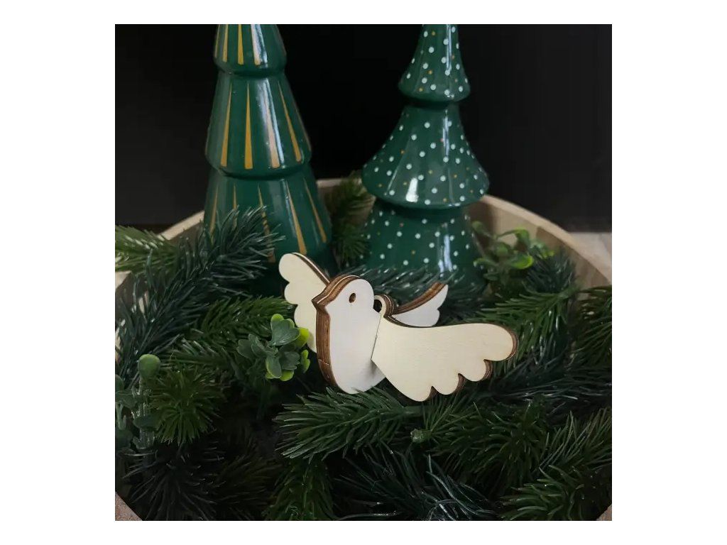 Holubička je odedávna považována za symbol míru, naděje a lásky. V našem podání získává tento tradiční motiv moderní tvář díky 3D konstrukci. Holubička není jen plochým výřezem; díky vloženým křídlům získává dynamiku a vypadá, jako by se právě chystala vzlétnout přímo z vašeho vánočního aranžmá. Je to malý detail, který však dokáže vyprávět velký příběh o klidu a rodinné pohodě.📐 Rozměry a technické parametry