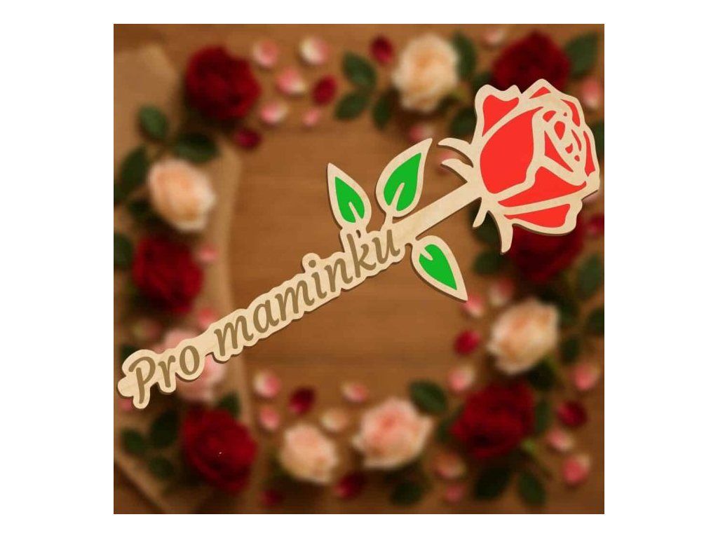 🪵 Růže je složená ze dvou vrstev dřeva – spodní část je barevná, horní vrstva s nápisem „Pro maminku“ dodává celku jemný prostorový dojem.