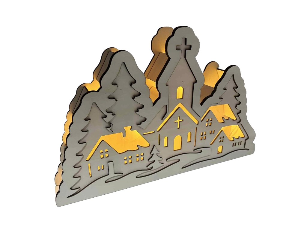 🪵 Vyrobeno z kvalitní topolové překližky. Přední vrstva s chaloupkami, uprostřed dominující kostel a zezadu jemné LED osvětlení pro pohádkový efekt.