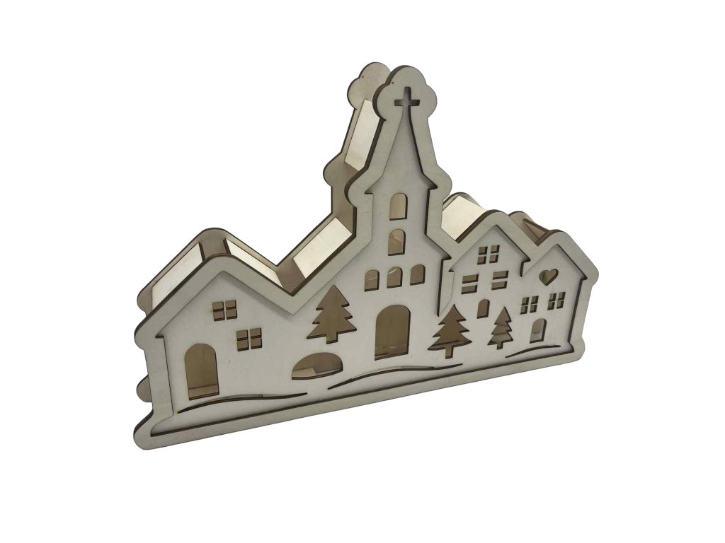 🪵 Vyrobeno z kvalitní topolové překližky. Přední vrstva s domečky, uprostřed dominantní kostel a zezadu jemné LED osvětlení pro pohádkový efekt.