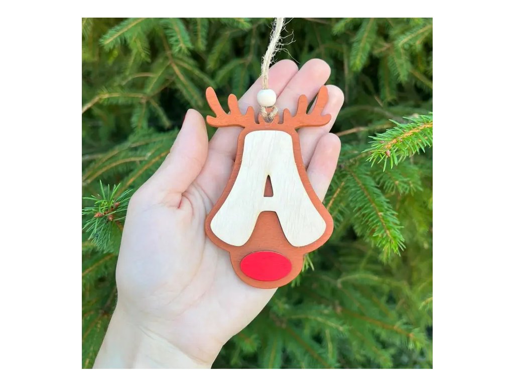 🎄 Kombinace hnědě natřené zadní vrstvy s parohy, přírodního písmena z překližky a červeného nosíku. Skvělé pro rodinné iniciály nebo personalizaci vánočního stromečku.