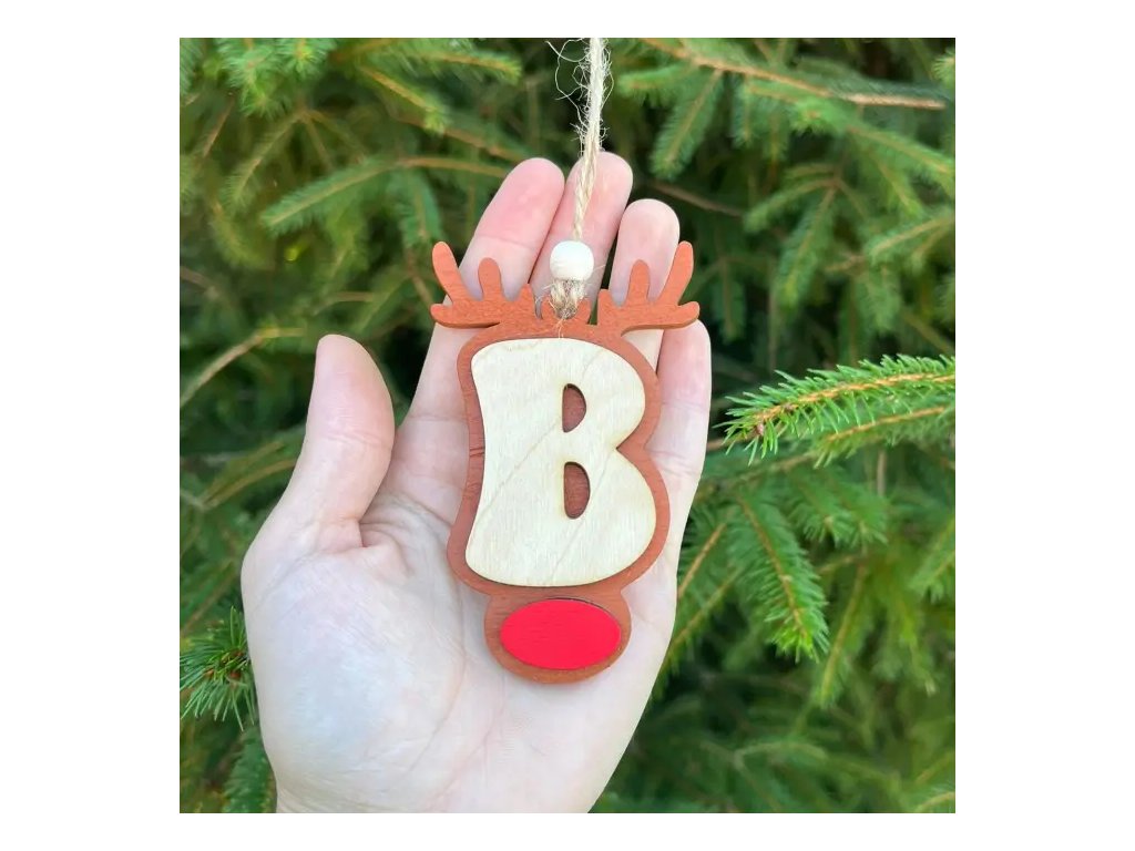 Roztomilá vánoční ozdoba ve tvaru soba s písmenem "B"! Dekorace s hnědými parohy, přírodním dřevěným písmenkem a červeným nosíkem. Perfektní pro iniciály rodiny na vánočním stromečku nebo jako originální vánoční dárek.