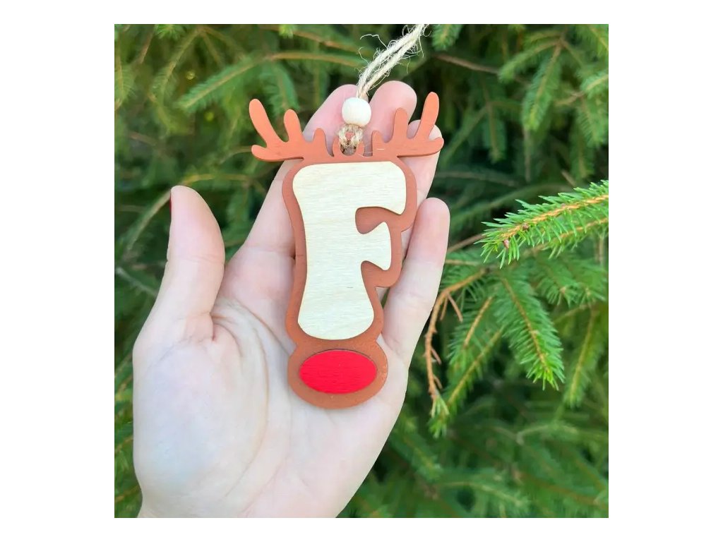 Roztomilá vánoční ozdoba ve tvaru soba s písmenem "F"! Dekorace s hnědými parohy, přírodním dřevěným písmenkem a červeným nosíkem. Perfektní pro iniciály rodiny na vánočním stromečku nebo jako originální vánoční dárek.