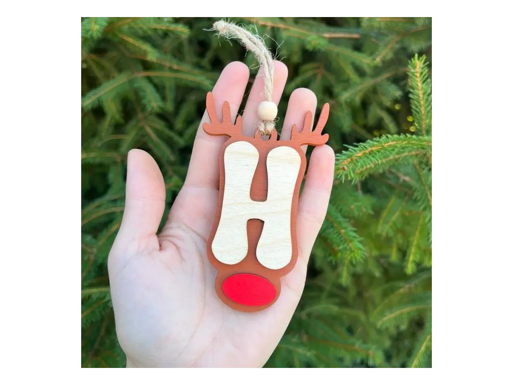 Roztomilá vánoční ozdoba ve tvaru soba s písmenem "H"! Dekorace s hnědými parohy, přírodním dřevěným písmenkem a červeným nosíkem. Perfektní pro iniciály rodiny na vánočním stromečku nebo jako originální vánoční dárek.
