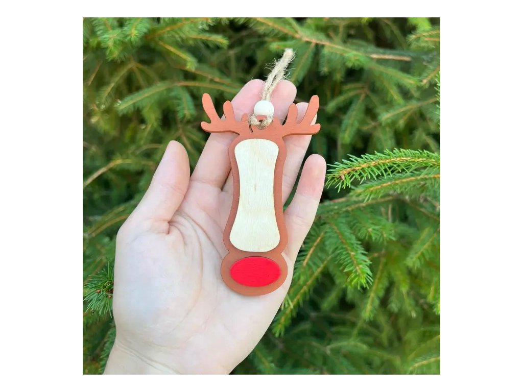 🎄 Kombinace hnědě natřené zadní vrstvy s parohy, přírodního písmena z překližky a červeného nosíku. Skvělé pro rodinné iniciály nebo personalizaci vánočního stromečku.