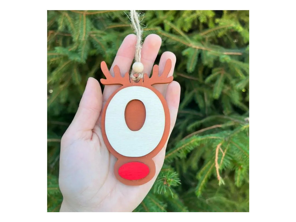 Roztomilá vánoční ozdoba ve tvaru soba s písmenem "O"! Dekorace s hnědými parohy, přírodním dřevěným písmenkem a červeným nosíkem. Perfektní pro iniciály rodiny na vánočním stromečku nebo jako originální vánoční dárek.