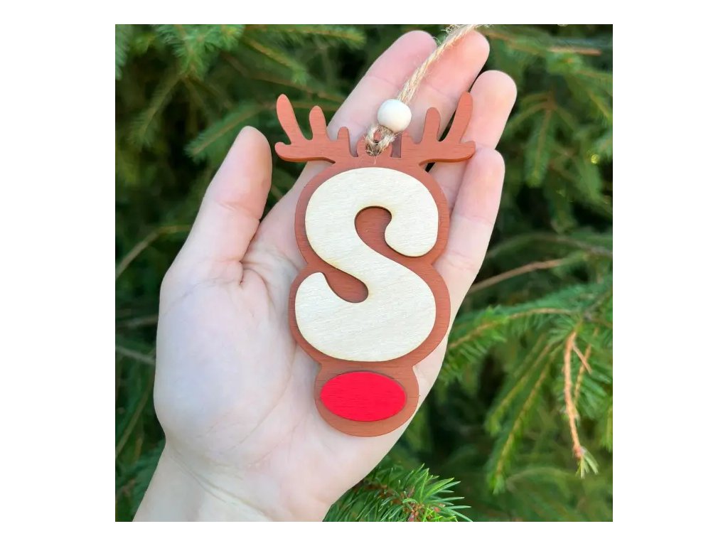 Roztomilá vánoční ozdoba ve tvaru soba s písmenem "S"! Dekorace s hnědými parohy, přírodním dřevěným písmenkem a červeným nosíkem. Perfektní pro iniciály rodiny na vánočním stromečku nebo jako originální vánoční dárek.