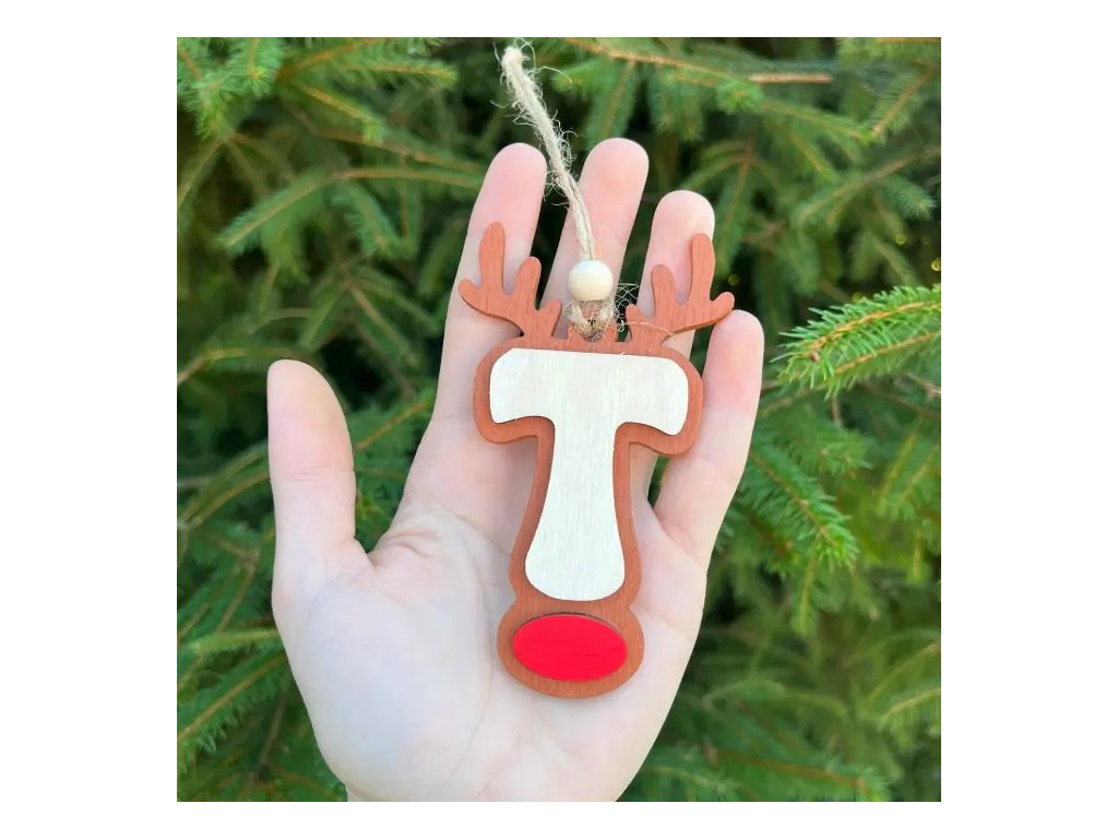 Roztomilá vánoční ozdoba ve tvaru soba s písmenem "T"! Dekorace s hnědými parohy, přírodním dřevěným písmenkem a červeným nosíkem. Perfektní pro iniciály rodiny na vánočním stromečku nebo jako originální vánoční dárek.