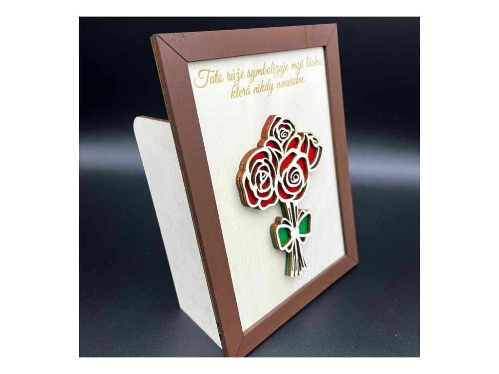 Tento jedinečný dřevěný rámeček ukrývá symbol nesmrtelné lásky – krásnou červenou růži doplněnou citátem: