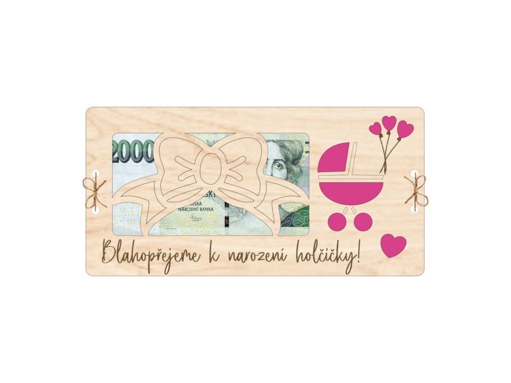 Krásná třívrstvá dřevěná kartička pro oslavu narození malé princezny! Zadní plná vrstva tvoří základ, druhá vrstva má výřez na bankovku a je nabarvená růžově, zatímco třetí vrstva má více dekorativních výřezů – hlavní otvor na viditelnost bankovky, roztomilý výřez kočárku a gravírovaný nápis „Blahopřejeme k narození holčičky“. Vrstvy jsou slepené k sobě a navíc přivázané stylovým provázkem, který prochází všemi vyřezanými dírkami. Perfektní způsob, jak darovat peníze novopečeným rodičům s elegancí a šarmem! 🎀👶💖