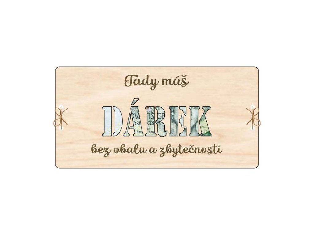 Na vrchní vrstvě kartičky je výřez „DÁREK“, kterým prosvítá bankovka ukrytá uvnitř.
