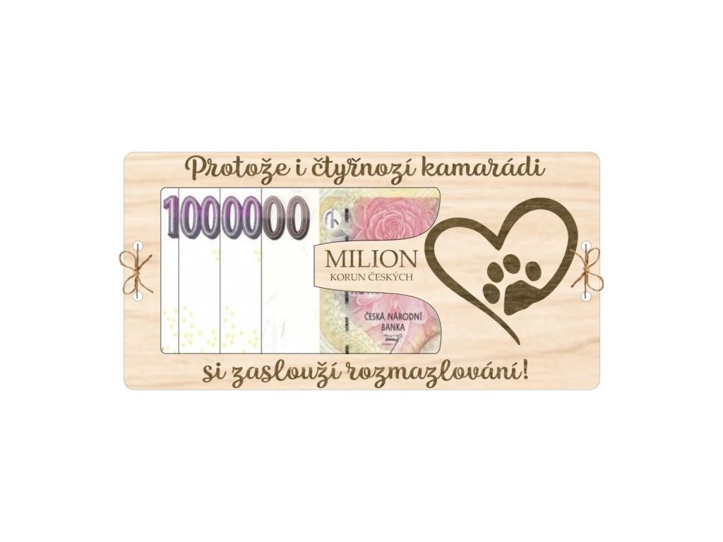 Stylová dřevěná kartička ve tvaru miliónu s roztomilým textem „Protože i čtyřnozí kamarádi si zaslouží rozmazlování.“ Kartička je složená ze tří vrstev – spodní plné, prostřední s výřezem na bankovku a horní s dekoracemi a nápisem. Vrstvy jsou svázané provázkem přes vyřezané dírky. Perfektní dárek pro majitele pejsků, koček i jiných mazlíčků, kteří chtějí svým chlupáčům dopřát něco extra! 🐶🐱✨