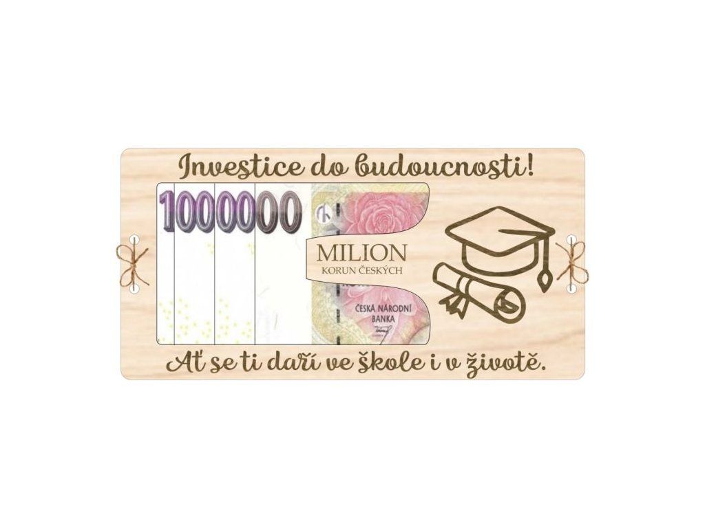 Originální dřevěná kartička ve tvaru miliónu s textem „Investice do budoucnosti! Ať se ti daří ve škole i v životě!“. Třívrstvý design: zadní plná vrstva, prostřední s výřezem na bankovku a horní s nápisem. Horní vrstva je připevněna k ostatním provázkem díky vyřezaným dírkám. Perfektní dárek pro studenty, absolventy nebo kohokoliv, kdo míří za svými sny! 🎓✨
