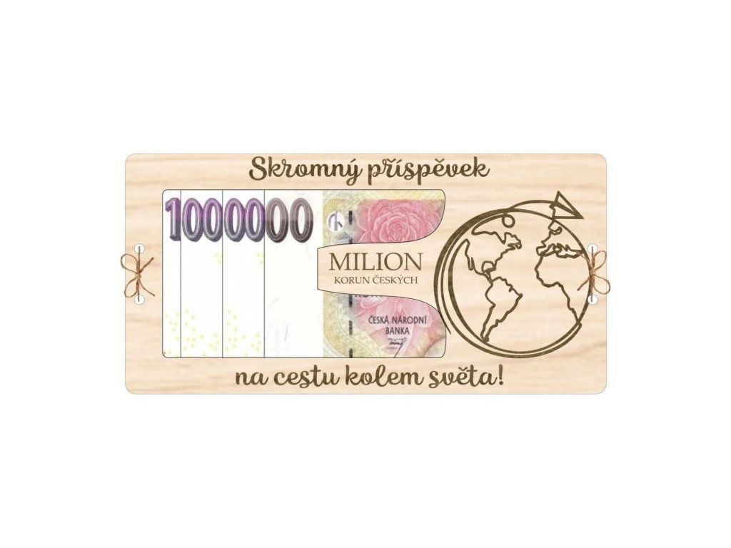 Nádherná dřevěná kartička ve tvaru miliónu s nápisem „Skromný příspěvek na cestu kolem světa!“ a motivem zeměkoule. Třívrstvý design: spodní plná vrstva, prostřední s výřezem na bankovku a horní s dekorativním nápisem a motivem. Vrstvy jsou pevně svázané provázkem skrz vyřezané dírky. Perfektní dárek pro dobrodruhy a milovníky cestování! 🌎✈️