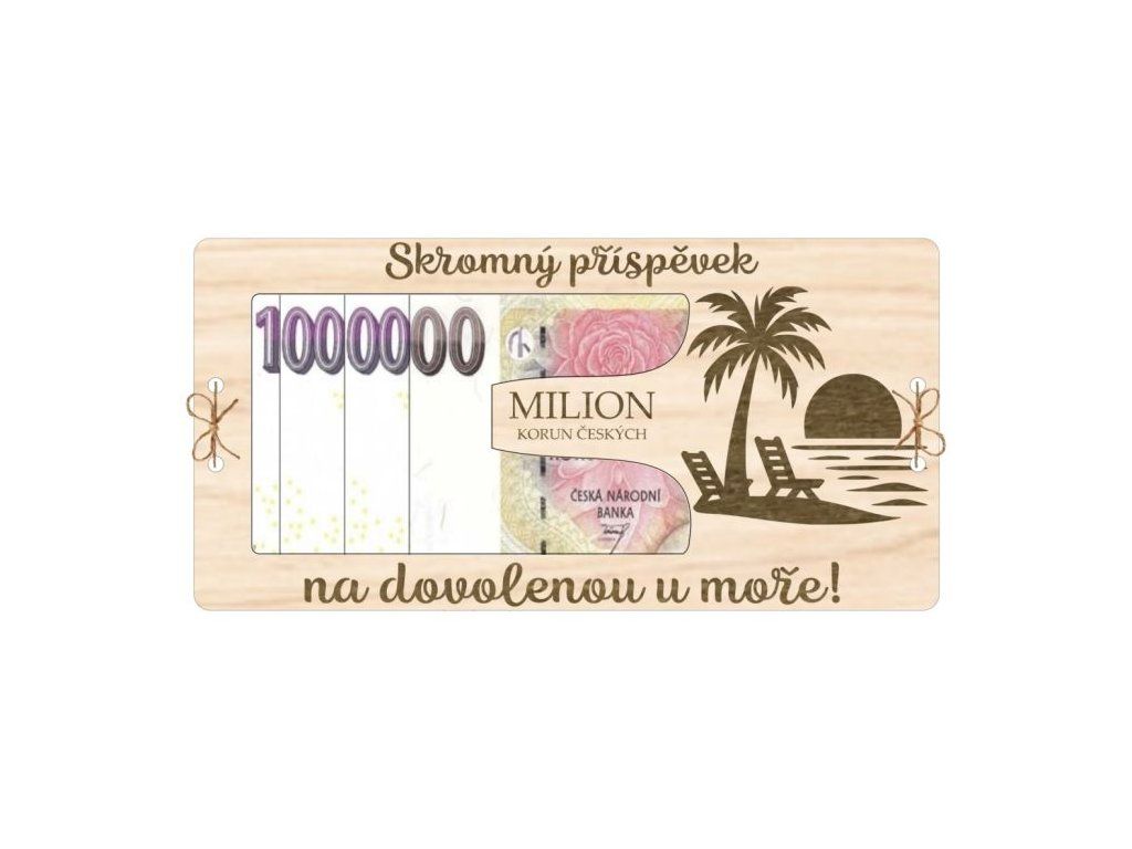 Originální dřevěná kartička ve tvaru miliónu s nápisem „Skromný příspěvek na dovolenou u moře!“ a letními motivy. Třívrstvý design: spodní plná vrstva, prostřední s výřezem na bankovku a horní s dekorativním nápisem a motivy. Vrstvy jsou spojeny provázkem skrz vyřezané dírky. Ideální dárek pro milovníky cestování a letních radovánek! 🌊☀️
