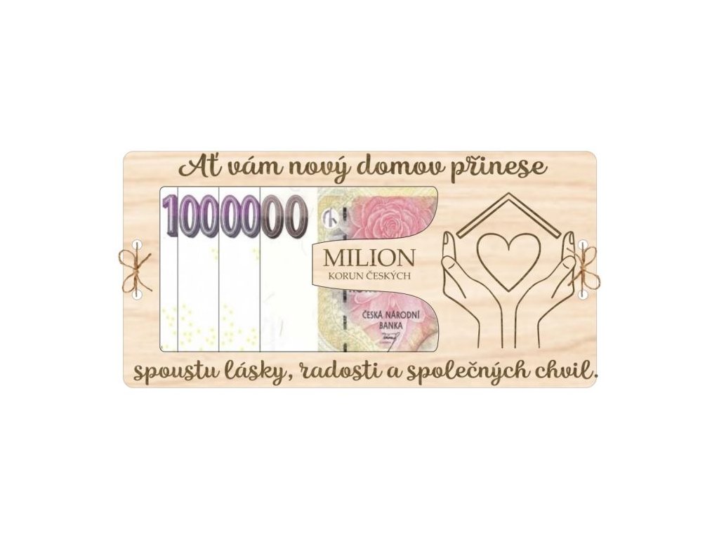 Krásná dřevěná kartička ve tvaru miliónu s nápisem „Ať vám nový domov přinese spoustu lásky, radosti a společných chvil“. Třívrstvý design: spodní plná vrstva, prostřední s výřezem na bankovku a horní s dekorativním nápisem. Vrstvy jsou pevně spojeny provázkem skrz vyřezané dírky. Ideální dárek pro novomanžele nebo přátele, kteří právě začínají novou kapitolu života! 🏠💖