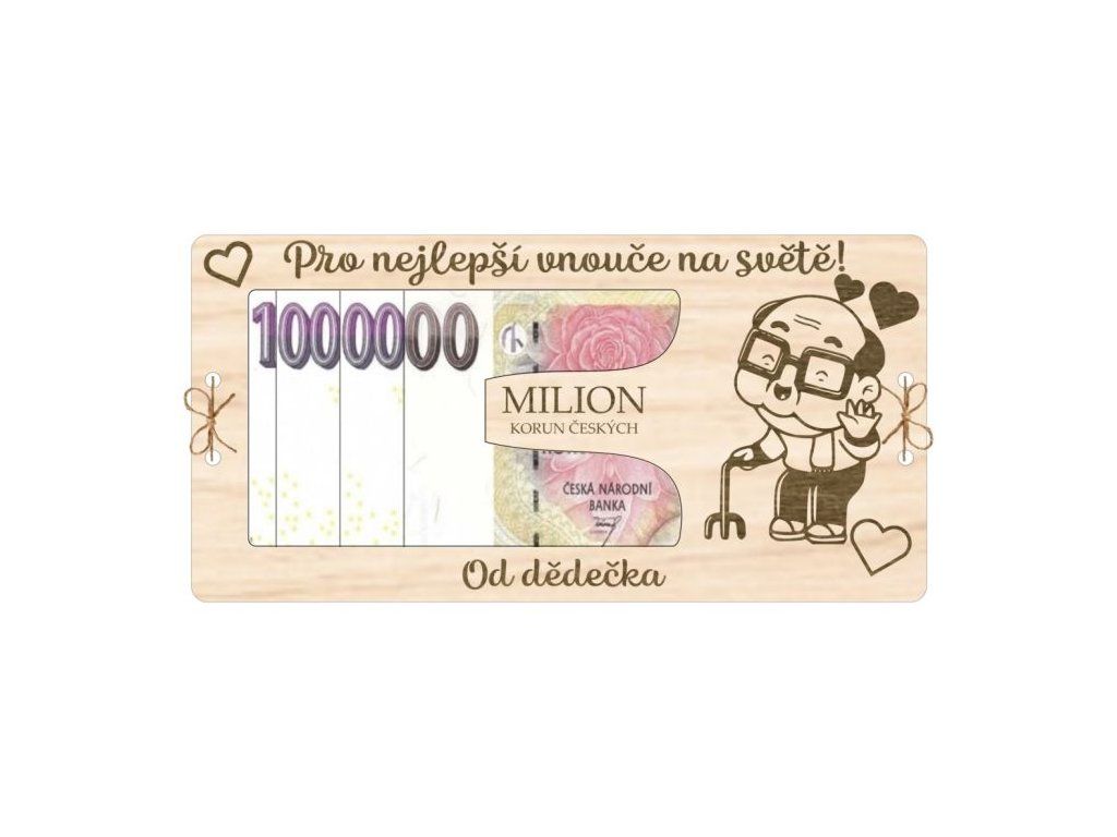 Stylová dřevěná kartička ve tvaru miliónu s nápisem „Pro nejlepší vnouče na světě! Od dědečka“. Třívrstvý design: spodní plná vrstva, prostřední s výřezem na bankovku a horní s milým nápisem. Vrstvy jsou pevně svázány provázkem skrz vyřezané dírky. Perfektní způsob, jak dědeček může darovat peníze originálně a s úsměvem! 💖💸