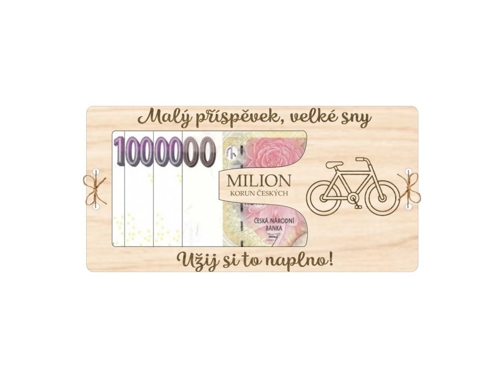 Originální dřevěná kartička ve tvaru miliónu s nápisem „Malý příspěvek, velké sny. Užíj si to naplno!“ a obrázkem kola. Třívrstvý design: spodní plná vrstva, prostřední s výřezem na bankovku a horní s dekorativním nápisem. Vrstvy jsou pevně spojené provázkem skrz vyřezané dírky. Perfektní dárek pro milovníky cyklistiky a sportu! 🚲