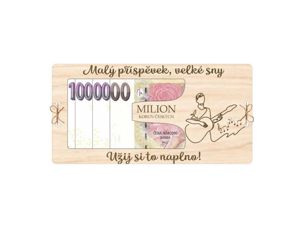 Originální dřevěná kartička ve tvaru miliónu s nápisem „Malý příspěvek, velké sny. Užíj si to naplno!“ a obrázkem kytary. Třívrstvý design: spodní plná vrstva, prostřední s výřezem na bankovku a horní s dekorativním nápisem. Vrstvy jsou pevně spojené provázkem skrz vyřezané dírky. Perfektní dárek pro každého hudebníka nebo kytarového nadšence! 🎶