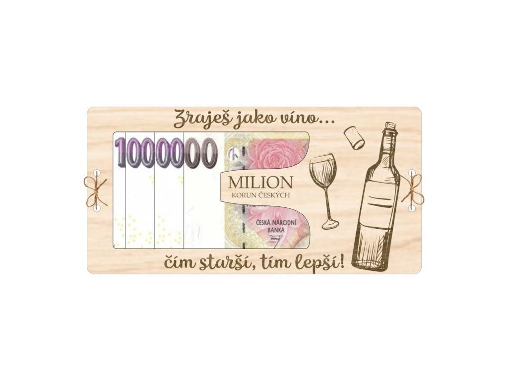 Vtipná dřevěná kartička ve tvaru miliónu s textem „Zraješ jako víno… čím starší, tím lepší!“. Třívrstvý design: zadní plná vrstva, prostřední s výřezem na bankovku a horní vrstva s nápisem a otvory pro provázek, který drží vše pohromadě. Skvělý dárek k narozeninám nebo jiné příležitosti, kdy chcete oslavence pobavit a potěšit! 🍷🎉