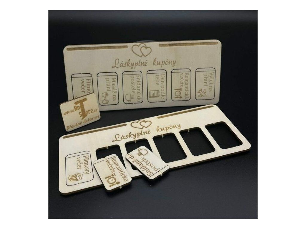 Láskyplné kupóny – originální valentýnský dárek Překvapte svou drahou polovičku romantickým dárkem! Dřevěná destička obsahuje 6 vylamovacích kuponů s láskyplnými zážitky, jako je romantická večeře, masáž na přání nebo výlet dle výběru. Ideální dárek k Valentýnu, výročí nebo jen tak z lásky. Udělejte radost stylovým a osobním dárkem!