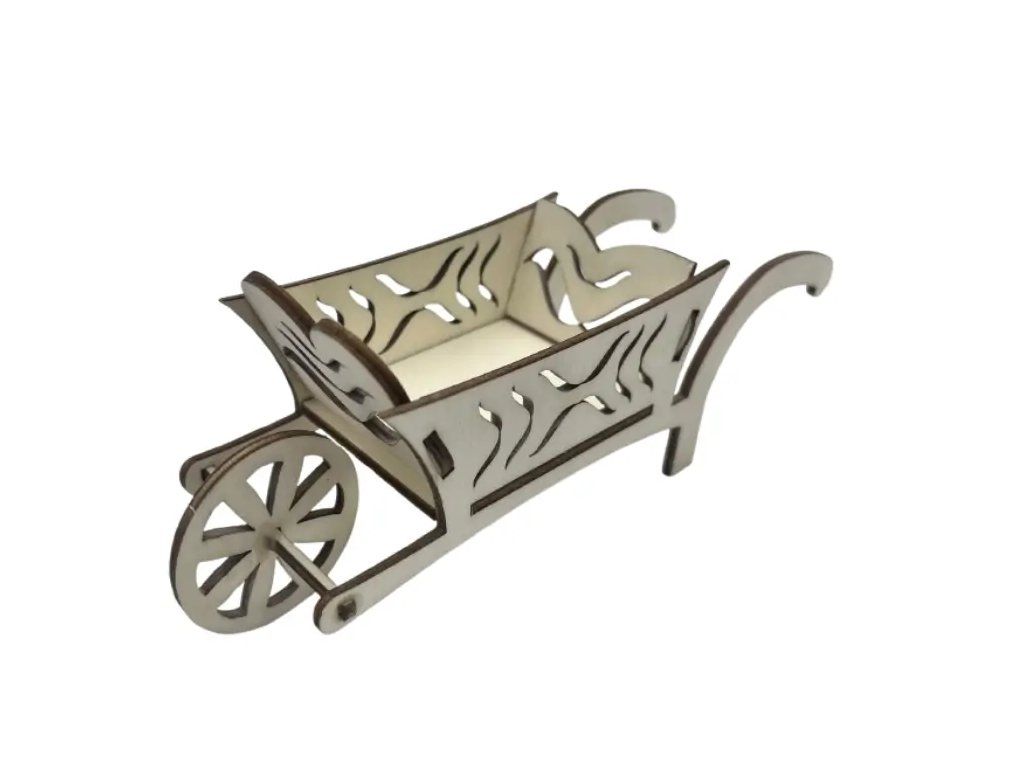 - Detailní prořezy: Bočnice zdobené jemným laserovým vyřezáváním, které dodávají trakaři lehkost a venkovský šmrnc.