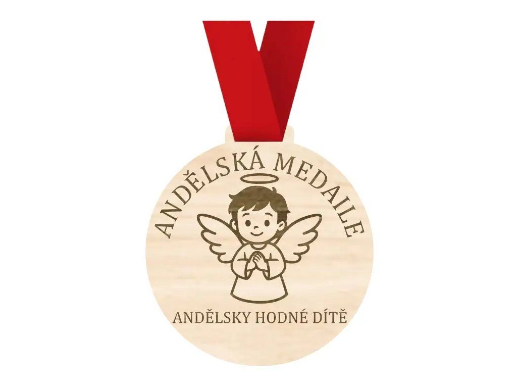 - Medaile je vyrobena z přírodního dřeva a zdobí ji gravírovaný usměvavý anděl s křídly a svatozáří. Nápis „Andělsky hodné dítě“ potvrdí jeho výborné chování.