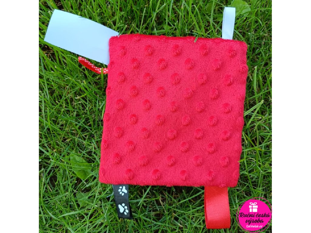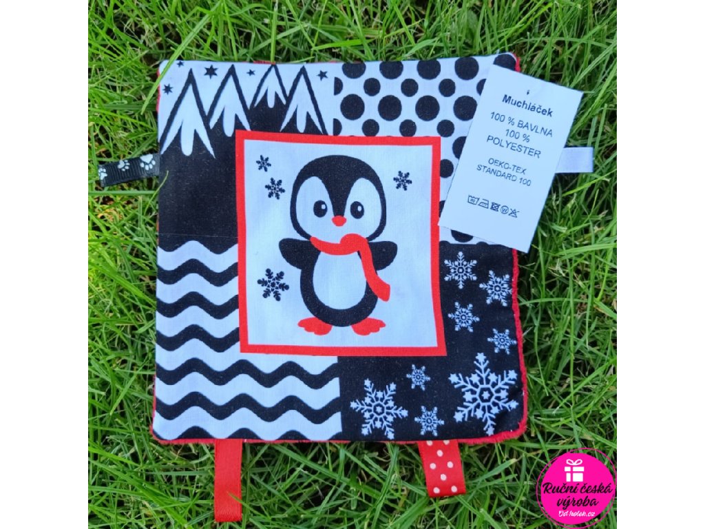 Kontrastní, šustí, příjemný na dotek, stužky podporující rozvoj jemné motoriky.