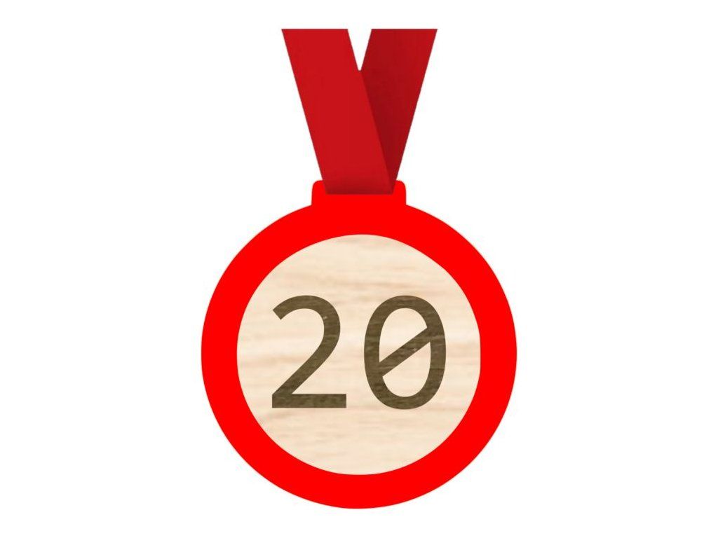 Vtipná dřevěná narozeninová medaile ve stylu dopravní značky s červeným prstencem (druhá vrstva), který vytváří výrazný 3D efekt a upozorňuje na číslo 20 uvnitř.