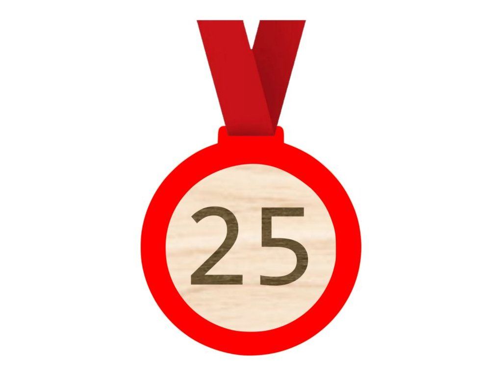 Vtipná dřevěná narozeninová medaile ve stylu dopravní značky s červeným prstencem, který vytváří 3D efekt a upozorňuje na číslo 25.