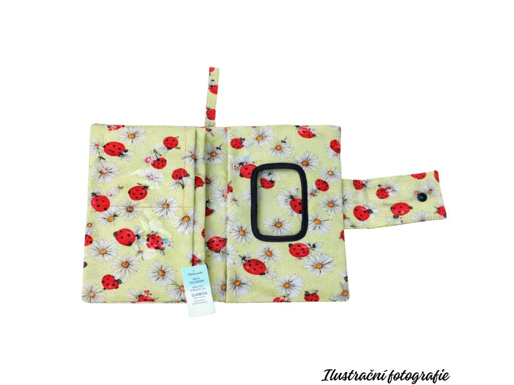 Uvnitř kapsa na vlhčené ubrousky (18x25 cm), 2 menší kapsy (13x15 cm), 1 větší kapsa (17x25 cm).