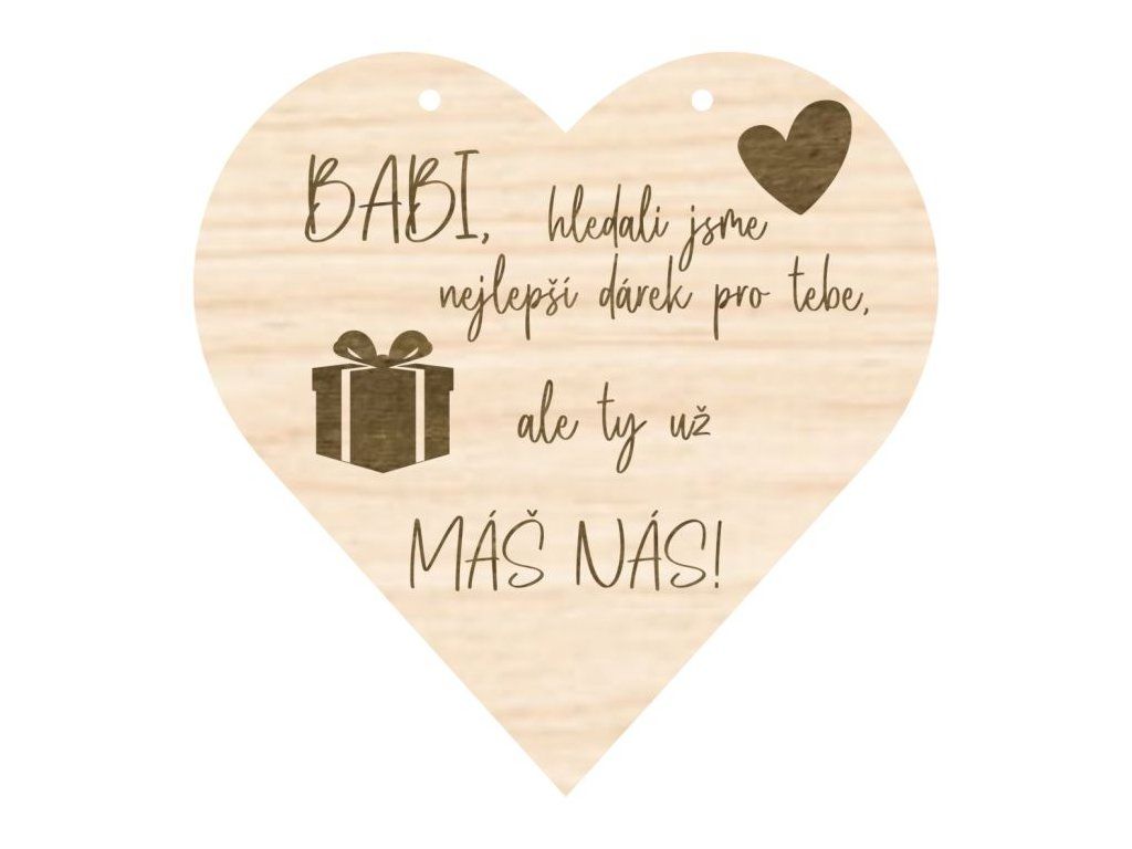 Dřevěné srdce s textem: „Babi, hledali jsme ten nejlepší dárek pro tebe, ale ty už máš nás!“ je krásným a dojemným dárkem pro každou babičku. Hodí se k narozeninám, na Den matek nebo jen tak z lásky. Vyrobeno z kvalitní překližky, srdíčko je nádherným gestem plným lásky ❤️.