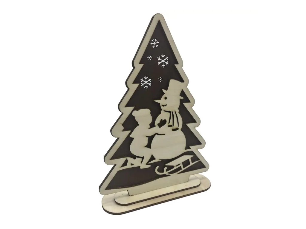 🪵 Zadní vrstva je nastříkaná hnědou barvou, přední silueta se sněhulákem je nalepená a celý stromeček stojí na pevném podstavci – připravený okamžitě ke zdobení.