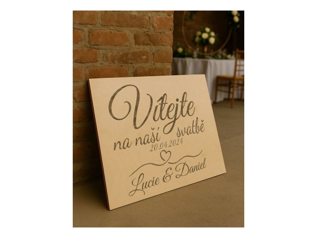 Na svatební ceduli je vygravírován text: „Vítejte na naší svatbě“, který doplňují iniciály novomanželů, které mohou být přizpůsobeny podle vašich požadavků.