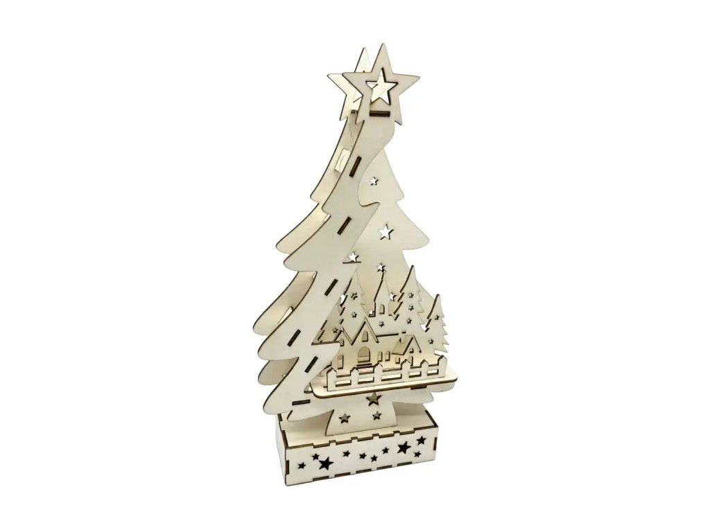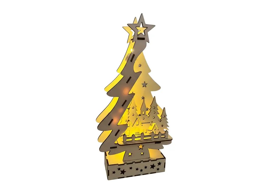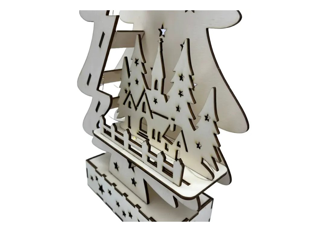 Pohádkový svět uvnitř siluety. Tato vysoká vánoční dekorace představuje fascinující kombinaci tradičního symbolu stromečku a kouzelné zimní scenérie. Celá dekorace je tvarována jako silueta vánočního stromečku, přičemž uvnitř se skrývá detailní zimní vesnička s domky a elegantním plotem v popředí.