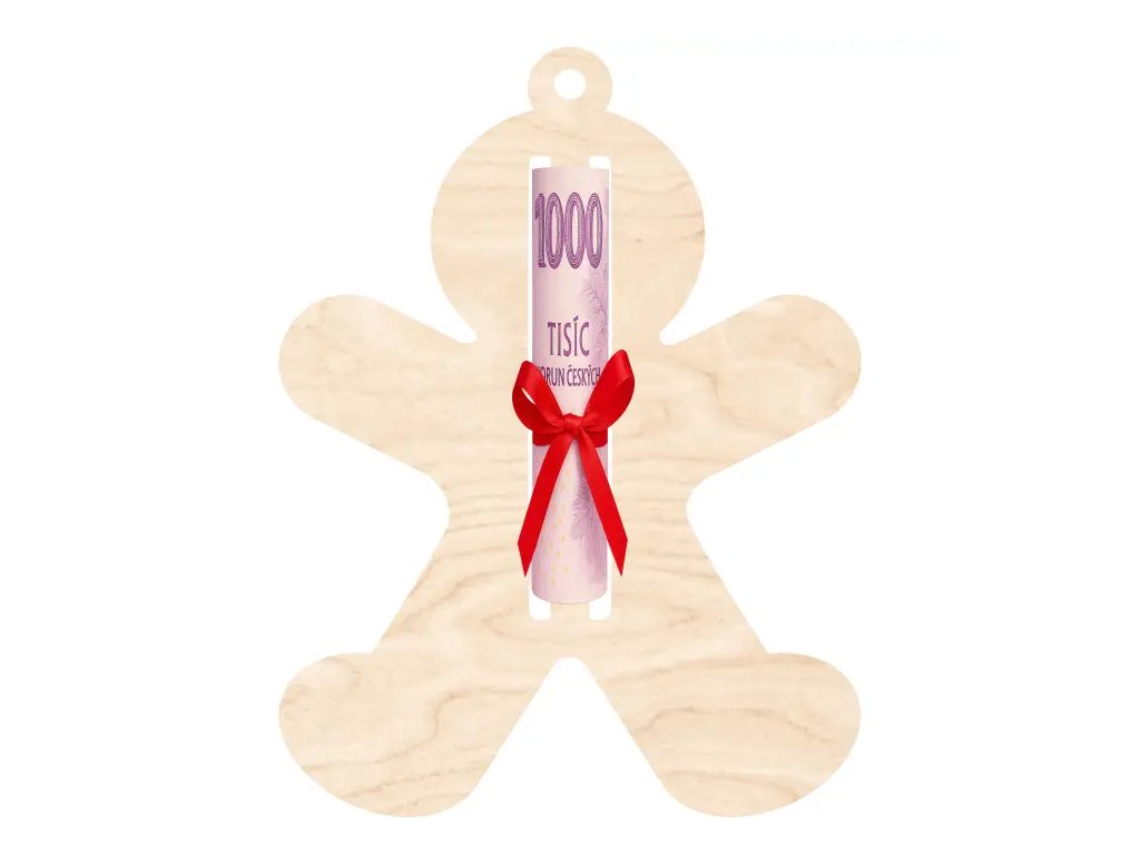 Náš dřevěný Perníček je alternativa k nudné obálce. Skvělý pro darování hotovosti s hravým nádechem. Bankovku stačí srolovat, protáhnout ji připraveným výřezem a pověsit na stromeček.
