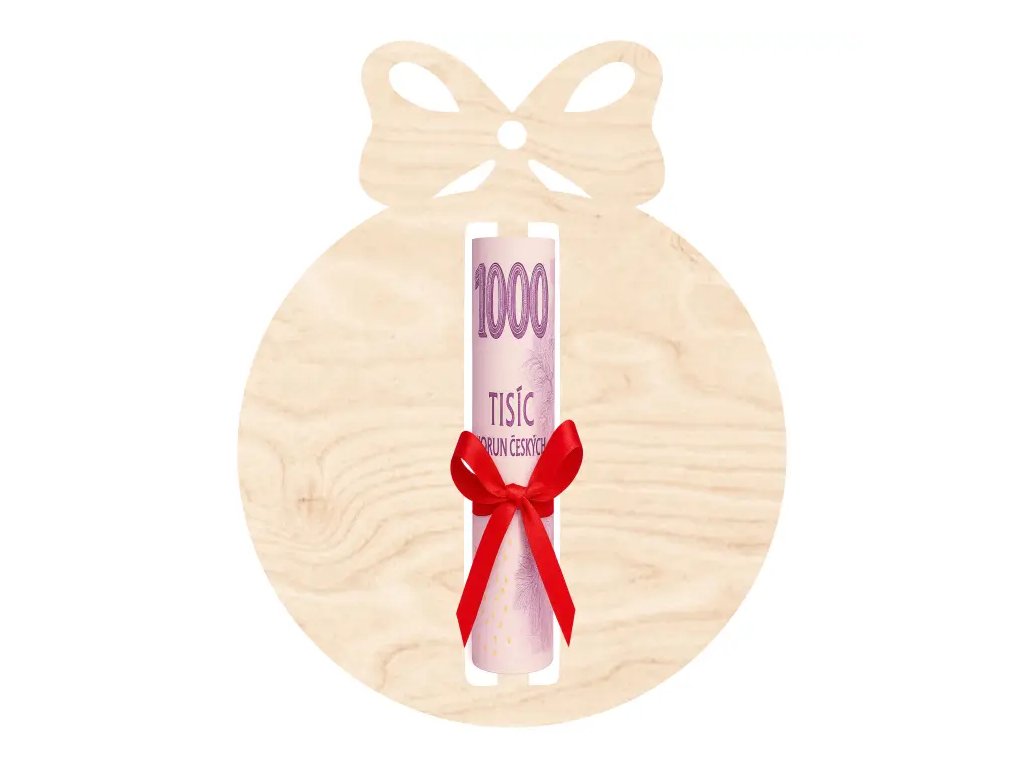 Zapomeňte na bílé obálky! Naše dřevěná vánoční baňka je krásný a hravý způsob, jak věnovat peníze – omotejte bankovku kolem výřezu, převázejte provázkem a pověste na stromeček.